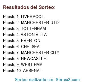 Lista de participantes: NEWCASTLE, ARSENAL, EVERTON, LIVERPOOL, CHELSEA, ASTON VILLA, TOTTENHAM, MANCHESTER UTD, MANCHESTER CITY, WEST HAM.
