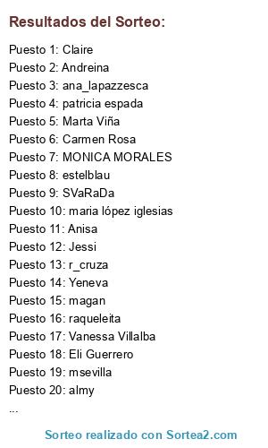 Lista de participantes: estelblau, sissuka, Kellyta, yolybel1000, xandra, MeryyD, mypinkbubble, Cristina273, Chic and Health, María Moreira, Xisca dijo..., Ana Fernandez, Omayra González Barreto dijo..., ángeles, NeDa, CRYS, msevilla, Andreina, Carmen, Ana María, geiserina dijo..., rosijr, Ana Belén, Ainara, Nerea González dijo..., kelika, Buchis dijo..., Lorena Alonso Gonzalez, milagros gonzalez, paularm23, blankita747, Arima erratu, Elenusqui dijo..., lola, Veronica perez, Limoncito, Kyllie, Nuria Macías García, SVaRaDa, Marina Martin Garcia, la_baby_yolanda(2 participaciones), moni, Dont Stop Madrid, Silvia Bartolome, MONICA MORALES, María, Claire, Anisa, La nenita, PLAlimentación, Angela Romero, LauRa, My FB Corner, marisa ferrando, MARIA Martínez, Isamar, Alba, Maria Medina, Zulema, patricia espada, Beatriz Marcos, Déborah Tg, Delirio, carmen maria, Victorian, mariajo79 dijo..., Sarita, Montse PM, almy, carmuela(2 participaciones), Vanessa Villalba, Eli Guerrero, Mar, anais, NuRya G., Ginger dijo..., PAZ AMOR, Jenny Xerez, Mireia *, María Eugenia, Babycosmetics, maria martinez, Nieves dijo..., ana83, Lydia Lopez Millan, angela carpente, Lidia Aguilar, magan, Endless Nights, marifloysuspotis, Cloti L.Gimenez, Anyol, Lorna, Passion 4 Nails Art, Carmen Trujillo, misela1970, jonolun, Yeneva, Alicia dijo..., Elisa Martinez, Adela Sendra, titaanita, Cris Pontetacones, gemma, Lola V, laura f, Natalia, evafr, mallirubi, Blanca Serrano, B SE, Eldena Paniagua, Meldewen, Beatriz Fernandez, Patry Berry, Soraya1889, Cerezas de tul, marrigi, Sandra Nancydemoniaca, Nuria García, Colorailla, Mcarmen Garrido, Dianne Tho, Alicia Pastora, Kalendula, Piluka, ana_lapazzesca, Sandra Zarina, Mandarinalia, Marta Viña, Didi, sílvia ortega, El tocador de Larissa, Hola, gracias por invitarme, participo encantada :), Marilynbedroom, Lara Diez, magdary gonzalez, DARMY, JARF8, Guillermo Antonio Díaz Peña, El Justo Punto Medio, Cristina Baños, maria rosa, Isabel Gragera, Pilina blanco blanco, nenita pg, Maribel R, JOANA SR, Carmen Rosa, Lori Tempest, Chica, jose ignacio, Mi nombre real, y mi nombre en facebook es: Carmen Castellano Juárez, Chischana Chrischana, Tamara Tejero, Kapitana Corsaria, maria lópez iglesias, Cristina DoBeauting, Lara García-Granero, Lucía Martínez, Katerina, Fanny Vega, isabelbg87, debodebo, My FB Corner dijo..., Maria Rosa, nanaz, esther quintana, raqueleita, mcruza20, Claudia L., marylyz, MMM^_^, Aniña (@vampyevil), Cris de nosencanta, r_cruza, Jessi, sofiaesther, Ananda Rock, karina ceballo.