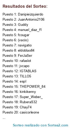 Lista de participantes: IGTABLAS, THEPOWER_84, eldoblao84, navigatio, TILLO5, jvcapo, casicorleone, Chay74, rafaslot, Danipieizquierdo, espI, Ladron_87, RuberaS32, Garri_967, fcougar, elcatena, kinkikenny, machacuto-99, Esp_Follonero_91, manuel_diaz_f1, nuvolari44, jvdgs24, FerJaSer, Guddy, jrlain, Super_Weber_, JuanAntonio2106, (vacio).
