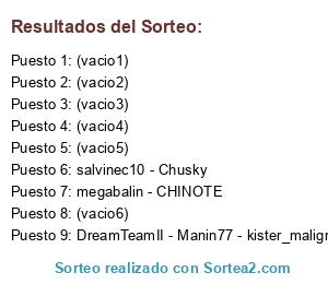 Lista de participantes: salvinec10 - Chusky, megabalin - CHINOTE, DreamTeamII - Manin77 - kister_maligno - jmg080204vlp, (vacio1), (vacio2), (vacio3), (vacio4), (vacio5), (vacio6).
