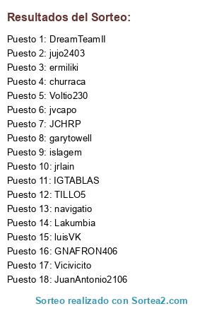 Lista de participantes: Voltio230, jvcapo, DreamTeamII, TILLO5, garytowell, ermiliki, GNAFRON406, JuanAntonio2106, JCHRP, churraca, navigatio, jujo2403, Vicivicito, luisVK, islagem, Lakumbia, IGTABLAS, jrlain.