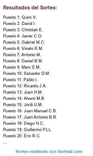 Lista de participantes: Fernando B.R.(6 participaciones), Quim V.(5 participaciones), Juan Manuel C.B.(6 participaciones), Gabriel M.C.(7 participaciones), Fulgencio O.S.(4 participaciones), Jordi U.M.(6 participaciones), Jose Luis C.(3 participaciones), Carlos D.(4 participaciones), Alejandro Manuel E.L., Jesús G.G., Antonio A.V.(8 participaciones), Encarni C., Javier C.O.(5 participaciones), Juan Pedro G.S.(2 participaciones), Francisco Manuel R.B.(2 participaciones), Marc E.M.(4 participaciones), Carlos C., Guillermo J.T., Pablo I.(2 participaciones), Carlos T.C.(2 participaciones), Jose Ignacio A.S.(4 participaciones), Juan H.M.(4 participaciones), Javier R.B., Jose Maria R.M.(4 participaciones), Antonio V.R.(2 participaciones), Juan Antonio B.R.(8 participaciones), Jorge B.F.(3 participaciones), Antonio M.(4 participaciones), Mario R.M.(5 participaciones), Daniel B.M.(4 participaciones), David P.G.(4 participaciones), Guillermo P.LL.(5 participaciones), Alvaro M.B.(5 participaciones), Salvador D.M., Mikel A.O.(2 participaciones), Víctor B.P.(4 participaciones), David I., Diego A.P.(3 participaciones), Ricardo J.A.(4 participaciones), Christian E.(3 participaciones), Nuria F., Diego N.C.(2 participaciones), Leopoldo P.L.(5 participaciones), Diego V., Viriato R.M.(2 participaciones), Eric R.C.(7 participaciones), Javier C.(4 participaciones), Gaizka S.V.(2 participaciones), Alexander B.(2 participaciones).