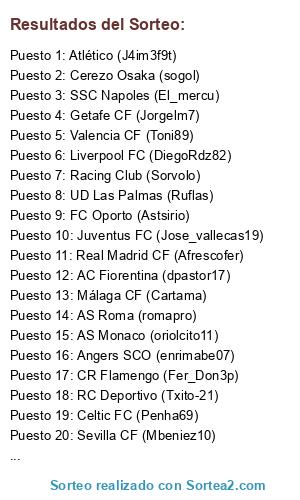 Lista de participantes: Angers SCO (enrimabe07), Arsenal FC (kingzell), Atlético (J4im3f9t), FC Barcelona (toni3_13), Cádiz CF (MIGUECHE), Celtic FC (Penha69), Cerezo Osaka (sogol), CSD Colo Colo (mageto), Córdoba CF (bubo_79), RC Deportivo (Txito-21), RCD Espanyol (ismahitaro), AC Fiorentina (dpastor17), CR Flamengo (Fer_Don3p), Getafe CF (Jorgelm7), EA Guingamp (ALTEZA_79), SD Huesca (Tete73), Juventus FC (Jose_vallecas19), UD Las Palmas (Ruflas), Liverpool FC (DiegoRdz82), Málaga CF (Cartama), AS Monaco (oriolcito11), SSC Napoles (El_mercu), FC Oporto (Astsirio), CA Osasuna (Masky), PSV Eindhoven (DeadpoolV7), Racing Club (Sorvolo), Rangers FC (Seli), Rayo Vallecano (edugodoy73), Real Madrid CF (Afrescofer), CF Reus (Amorte), AS Roma (romapro), Sevilla CF (Mbeniez10), CD Tenerife (Josenivaria), Valencia CF (Toni89), Villarreal CF (Poyis05), FC Zenit (x-lobito-2014).