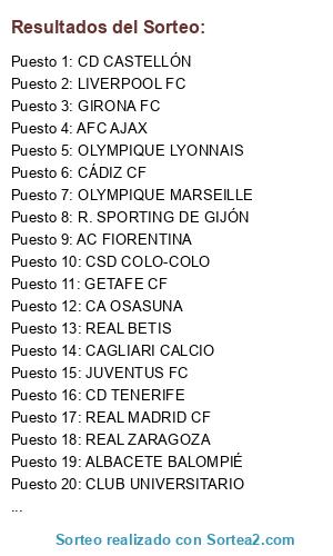 Lista de participantes: AL SADD SC, AFC AJAX, ALBACETE BALOMPIÉ, ANGERS SCO, ATHLETIC CLUB, C. ATLÉTICO DE MADRID, C. ATLÉTICO MINEIRO, FC BARCELONA, FC BAYERN MÜNCHEN, REAL BETIS, CÁDIZ CF, CAGLIARI CALCIO, CD CASTELLÓN, CELTIC FC, CHELSEA FC, CSD COLO-COLO, SC CORINTHIANS, EVERTON FC, AC FIORENTINA, GENOA CFC, GETAFE CF, GIRONA FC, GRANADA CF, JUVENTUS FC, LIVERPOOL FC, MÁLAGA CF, RCD MALLORCA, CD MIRANDÉS, SSC NAPOLI, OLYMPIQUE LYONNAIS, OLYMPIQUE MARSEILLE, AS MONACO, CA OSASUNA, PARIS SAINT GERMAIN, PARMA CALCIO 1913, RAYO VALLECANO, REAL MADRID CF, CA RIVER PLATE, AS ROMA, SÃO PAULO FC, SEVILLA FC, R. SPORTING DE GIJÓN, SPORTING CP, CD TENERIFE, CLUB UNIVERSITARIO, VILLARREAL CF, WEST HAM UNITED FC, REAL ZARAGOZA.