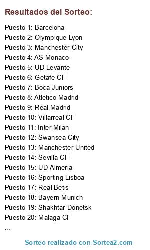 Lista de participantes: Malaga CF, Barcelona, Boca Juniors, Sporting Lisboa, Manchester City, UD Almeria, Real Betis, Juventus, Feyenoord, AS Monaco, Atletico Madrid, UD Levante, Villarreal CF, Sevilla CF, Chelsea, Napoles, Bayern Munich, Inter Milan, Real Madrid, Shakhtar Donetsk, Olympique Lyon, Swansea City, Manchester United, Getafe CF.