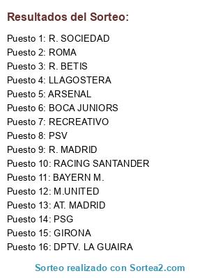 Lista de participantes: RECREATIVO, GIRONA, PSG, PSV, BAYERN M., LLAGOSTERA, R. MADRID, M.UNITED, R. BETIS, AT. MADRID, BOCA JUNIORS, RACING SANTANDER, ARSENAL, DPTV. LA GUAIRA, ROMA, R. SOCIEDAD.