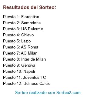 Lista de participantes: Juventus FC, Inter de Milan, Napoli, Fiorentina, Lazio, Genova, AC Milan, US Palermo, AS Roma, Udinese Calcio, Chievo, Sampdoria.