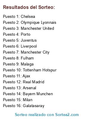 Lista de participantes: Manchester City, Malaga, Ajax, Manchester United, Real Madrid, Chelsea, Olympique Lyonnais, Tottenham Hotspur, Milan, Galatasaray, Bayern Munchen, Liverpool, Porto, Arsenal, Juventus, Fulham.
