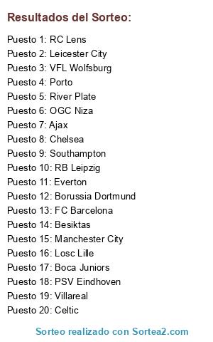 Lista de participantes: Ajax, Besiktas, Boca Juniors, Borussia Dortmund, Celtic, Chelsea, Everton, FC Barcelona, Leicester City, Losc Lille, Manchester City, OGC Niza, Porto, PSV Eindhoven, RB Leipzig, RC Lens, River Plate, Southampton, VFL Wolfsburg, Villareal.