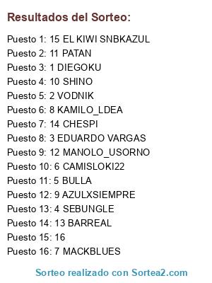 Lista de participantes: 1 DIEGOKU, 2 VODNIK, 3 EDUARDO VARGAS, 4 SEBUNGLE, 5 BULLA, 6 CAMISLOKI22, 7 MACKBLUES, 8 KAMILO_LDEA, 9 AZULXSIEMPRE, 10 SHINO, 11 PATAN, 12 MANOLO_USORNO, 13 BARREAL, 14 CHESPI, 15 EL KIWI SNBKAZUL, 16.