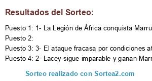 Lista de participantes: 1- La Legión de África conquista Marruecos, 2- Lacey sigue imparable y ganan Marruecos, 3- El ataque fracasa por condiciones atmosfericas, .