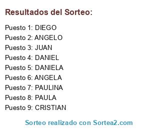 Lista de participantes: ANGELA, ANGELO, CRISTIAN, DANIEL, DANIELA, DIEGO, JUAN, PAULA, PAULINA.