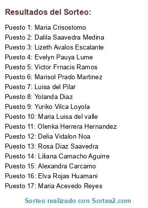 Lista de participantes: Delia Vidalon Noa, Liliana Camacho Aguirre, Evelyn Pauya Lume, Maria Acevedo Reyes, Victor Frnacis Ramos, Lizeth Avalos Escalante, Yuriko Vilca Loyola, Maria Crisostomo, Alexandra Carcamo, Yolanda Diaz, Marisol Prado Martinez, Elva Rojas Huamani, Olenka Herrera Hernandez, Rosa Diaz Saavedra, Dalila Saavedra Medina, Maria Luisa del valle, Luisa del Pilar.