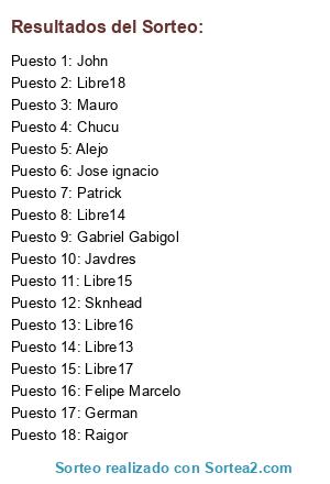 Lista de participantes: Raigor, Javdres, Chucu, Jose ignacio, Alejo, John, Mauro, German, Patrick, Sknhead, Felipe Marcelo, Gabriel Gabigol, Libre13, Libre14, Libre15, Libre16, Libre17, Libre18.