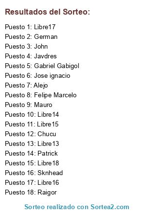 Lista de participantes: Raigor, Javdres, Chucu, Jose ignacio, Alejo, John, Mauro, German, Patrick, Sknhead, Felipe Marcelo, Gabriel Gabigol, Libre13, Libre14, Libre15, Libre16, Libre17, Libre18.