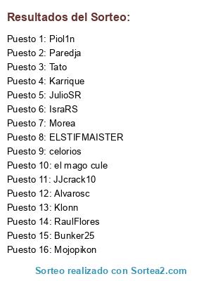 Lista de participantes: el mago cule, Piol1n, Bunker25, Mojopikon, Alvarosc, JJcrack10, JulioSR, Klonn, Morea, Paredja, Karrique, celorios, RaulFlores, Tato, IsraRS, ELSTIFMAISTER.