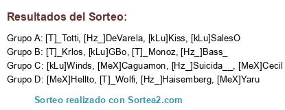 Lista de participantes: [kLu]GBo, [kLu]Kiss, [kLu]SalesO, [kLu]Winds, [T]_Wolfi, [T]_Krlos, [T]_Monoz, [T]_Totti, [MeX]Yaru, [MeX]Hellto, [MeX]Cecil, [MeX]Caguamon, [Hz_]Haisemberg, [Hz_]Suicida__, [Hz_]Bass_, [Hz_]DeVarela.