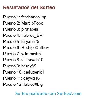 Lista de participantes: RodrigoCaffrey, MarcioPopo, cedugenio1, victorweb10, fabio80btg, luryan679, Fabreu_BR, herdy85, deyvid16, piratapes, ferdnando_sp, wilmonstro.