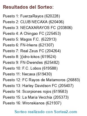 Lista de participantes: La Maria Vecchia (205373), Scorpiones rojos (619583), NECAXARAYOS FC (203806), FN-Dwendes (625482), Harley Davidson FC (205407), F.C. Lobos (619588), A Chingao FC (225453), Magos F.C. (622913), }{idro-lokos (619524), FN-Irkens (621307), Necaxa (619430), Wronskianos (621937), FC Rayos de Matamoros (26883), FuerzaRayos (620228), Real Zeus FC (204264), CLUB NECAXA (620406).
