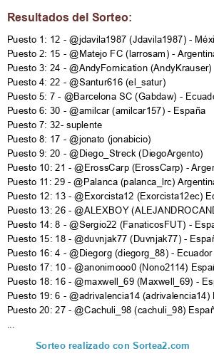 Lista de participantes: 7- @Barcelona SC (Gabdaw) - Ecuador, 21 - @ErossCarp (ErossCarp) - Argentina -, 10 - @anonimooo0 (Nono2114) España, 15 - @Matejo FC (larrosam) - Argentina, 24 - @AndyFornication (AndyKrauser), 25 - @Tomi02 (Tomi-cabj02), @LiamGallagher, 8 - @Sergio22 (FanaticosFUT) - 13 - @Exorcista12 (Exorcista12ec).