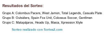 Lista de participantes: Colombus Pacers, Matapájaros, Heads Up, Spain Fox Unit, West Jamon, Masia, Colossus Soccer, Total Legends, Gentlmen, Outsiders, Casuals Plate, Xpression Xtyle.