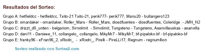 Lista de participantes: Coleridge - JMN_N2, Sirnolimit - Sirnolimit, MikyMr7 - MikyMr7, omardaker - omardaker, dani11 - Danieee_11, Roller_Mars - Roller_Mars, bf-pipaloko-bf - bf-pipaloko-bf, diosdfuentes - diosdfuentes, drizzt_d0_urden - belgariom, collangelo_ collangelo, franky96 - xFran96_2, Txito-21 Txito-21, hetfieldcc - hetfieldcc, Asanvillauskas - asanvilla, xRodri_ - xRodri_, Tungsteno - Tungsteno, perik777- perik777, Manu20 - bullangero123, Pirelli - PireLLi17, Regnum - regnumllion.
