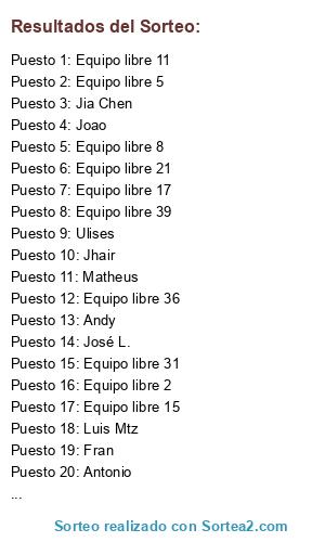 Lista de participantes: Antonio, Tavi, Xavier, Tadeo, Siglaz, Andy, Lalo, David, Cellfaction, Gonza, Fran, Zizou, Julimar, Jean, Alex B., Andres, Juanjo, Luis Mtz, Raul, José L., Tony, Jhair, Matheus, Joao, Jia Chen, Ulises, Equipo libre 1, Equipo libre 2, Equipo libre 3, Equipo libre 4, Equipo libre 5, Equipo libre 6, Equipo libre 7, Equipo libre 8, Equipo libre 9, Equipo libre 10, Equipo libre 11, Equipo libre 12, Equipo libre 13, Equipo libre 14, Equipo libre 15, Equipo libre 16, Equipo libre 17, Equipo libre 18, Equipo libre 19, Equipo libre 20, Equipo libre 21, Equipo libre 22, Equipo libre 23, Equipo libre 24, Equipo libre 25, Equipo libre 26, Equipo libre 27, Equipo libre 28, Equipo libre 29, Equipo libre 30, Equipo libre 31, Equipo libre 32, Equipo libre 33, Equipo libre 34, Equipo libre 35, Equipo libre 36, Equipo libre 37, Equipo libre 38, Equipo libre 39, Equipo libre 40, Equipo libre 41, Equipo libre 42, Equipo libre 43.