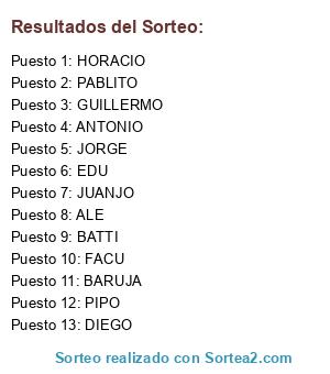 Lista de participantes: BARUJA, PIPO, HORACIO, GUILLERMO, JUANJO, JORGE, ALE, BATTI, EDU, ANTONIO, FACU, DIEGO, PABLITO.