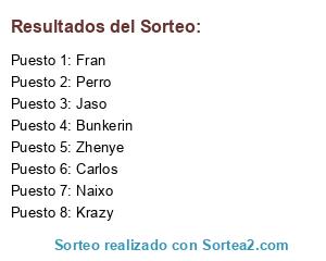 Lista de participantes: Naixo, Jaso, Perro, Bunkerin, Zhenye, Fran, Carlos, Krazy.