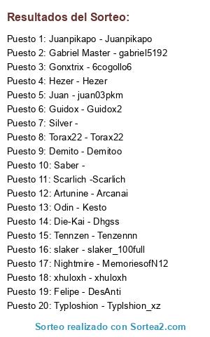 Lista de participantes: Odin - Kesto, Typloshion - Typlshion_xz, Artunine - Arcanai, Hezer - Hezer, Demito - Demitoo, Juan - juan03pkm, Felipe - DesAnti, Silver -, Saber -, Scarlich -Scarlich, Nightmire - MemoriesofN12, Juanpikapo - Juanpikapo, Torax22 - Torax22, Gonxtrix - 6cogollo6, xhuloxh - xhuloxh, slaker - slaker_100full, Die-Kai - Dhgss, Guidox - Guidox2, Gabriel Master - gabriel5192, Tennzen - Tenzennn.