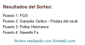 Lista de participantes: Newells Fs, Pollos Hermanos, FGS, Ganador Celtics - Piratas del cacik.