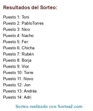 Lista de participantes: Toni, Novo, Chicha, Vior, Borja, Jon, Andrés, Torre, PabloTorres, Nico, Rubén, Fer, Nacho, Adri.