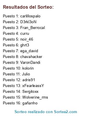 Lista de participantes: Sergitoxx, ghrt3, Wolverine_rms, ega_david, carlillospalo, xFearleassY, noir_46, Julio, adris91, chavahacker, VaronDandi, gañanho, D3rkl3oN, Fran_Berrocal, curru, kolorin.