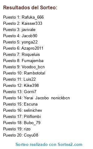 Lista de participantes: selinichev, yonga22, Rafuka_666, Gorrii7, Escuna, Roqueluis, Jacob90, javivale, Kaisser333, rizo, Voodoo_bcn, Fumajemba, Kike398, Coyu08, Rambototal, Pitiflombi, Azapro2011, Bubo_79, Luis22, Yerai Jacobo nonickbcn.