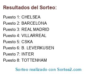 Lista de participantes: REAL MADRID, B. LEVERKUSEN, CHELSEA, INTER, BARCELONA, TOTTENHAM, CSKA, VILLARREAL.