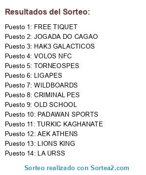 Lista de participantes: TORNEOSPES, LIGAPES, OLD SCHOOL, TURKIC KAGHANATE, WILDBOARDS, JOGADA DO CAGAO, HAK3 GALACTICOS, VOLOS NFC, AEK ATHENS, LIONS KING, LA URSS, CRIMINAL PES, PADAWAN SPORTS, FREE TIQUET.
