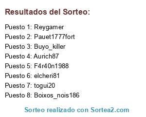 Lista de participantes: togui20, Aurich87, Reygamer, Pauet1777fort, F4r40n1988, Boixos_nois186, elcheri81, Buyo_killer.