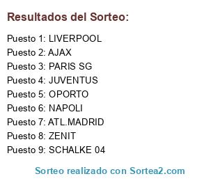 Lista de participantes: AJAX, JUVENTUS, NAPOLI, SCHALKE 04, ZENIT, LIVERPOOL, ATL.MADRID, OPORTO, PARIS SG.