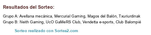 Lista de participantes: Avellana mecánica, UcO GaMeRS Club, Magos del Balón, Neith Gaming, Mercurial Gaming, Vendetta e-sports, Club Balompié, Txuriurdinak.