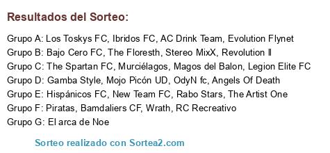 Lista de participantes: Piratas, Murciélagos, Bajo Cero FC, Rabo Stars, Los Toskys FC, El arca de Noe, Stereo MixX, AC Drink Team, The Artist One, Angels Of Death, The Spartan FC, RC Recreativo, The Floresth, Hispánicos FC, Gamba Style, Magos del Balon, Revolution ll, Evolution Flynet, OdyN fc, Ibridos FC, Bamdaliers CF, Wrath, Legion Elite FC, New Team FC, Mojo Picón UD.