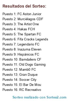 Lista de participantes: Team Origen, PuTTO's Club, Revolution United FC, PERICOS CF, Andaluces FC, Mamb0 FC, Esencia CF, Bamdaliers CF, SAD Sobrassada, PichaReal FC, Hispánicos FC, Legendario FC, Fifa Cracks Legends, RC Recreativo, Mad Horse, FC Aston Junior, Murciélagos CDF, Old Dogs Gaming.