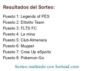 Lista de participantes: Crow Up eSports, Pokemon Go, FLTS FC, Legends of PES, La mina, Muppet, Club Almenara, Ettorito Team.
