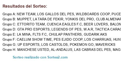 Lista de participantes: BALONP3S COOP, LOS GALLOS DEL PES, PES EJIDO COOP, GTA PRO ESPORTS, PUCEGRANTES F.C, LA TARA DE FEKIR, CLUB ALMENARA ATLETI, HUNTER TEAM, LAS CABRAS DEL PES, AL-ANDALUS, LA MINA, FLTS F.C, BEER LOVERS, MUPPET, GUDARIK AKS, ETTORITO TEAM, LEGENDS OF PES, NEW TEAM, TACTICA CARACOL, LOS CHARRUAS, WILDBOARDS COOP, LOS CASTOLOS, POKEMON GO, CUENCA EAGLES F.C, YONKIS DEL PRO, MANCHESE USTED, MAGIC POTAGIC, CAELUM SHOW TIME, CHULAP PANTHERS, UP ESPORTS, W.A.R, MAVERICKS.