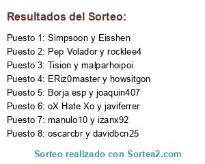 Lista de participantes: oX Hate Xo y javiferrer, ERiz0master y howsitgon, Borja esp y joaquin407, Tision y malparhoipoi, Pep Volador y rocklee4, oscarcbr y davidbcn25, Simpsoon y Eisshen, manulo10 y izanx92.