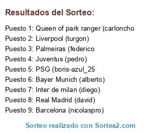 Lista de participantes: Barcelona (nicolaspro), PSG (boris-azul_25), Liverpool (turgon), Inter de milan (diego), Real Madrid (david), Queen of park ranger (carloncho), Juventus (pedro), Palmeiras (federico), Bayer Munich (alberto).