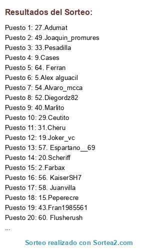 Lista de participantes: 1.Jorcha, 2.Farbax, 3.Danidante, 4.Cortex, 5.Alex alguacil, 6.Baena betis, 7.Depay_777, 8.Ancelotti, 9.Cases, 10.Ferdon, 11.chrtn93, 12.Luisixu, 13.Jorgelm7, 14.Intocable, 15.Peperecre, 16.Rodrigoroig, 17.Predator, 18.Topo1610, 19.Joker_vc, 20.Scheriff, 21.Kion, 22.asg86zzz, 23.Danielito, 24.Erkobra, 25.Abforz, 26.Lolito, 27.Adumat, 28.Valle, 29.Ceutito, 30.Ale_87ita, 31.Cheru, 32.Dbandee, 33.Pesadilla, 34.Pepteam, 35.Isra_mueka, 36.Soccatala73, 37.Delle_alpi, 38.Blessed_dani, 39.Husone7, 40.Marlito, 41. Yeli, 42.JoanFCB, 43.Fran1985561, 44.Querol, 45.Vega, 46.X-peridtj-X, 47.Josesg, 48.Fista, 49.Joaquin_promures, 50.Ekoh, 51.Simarro_13, 52.Diegordz82, 53.Caubo12, 54.Alvaro_mcca, 55. Meneos90, 56. KaiserSH7, 57. Espartano__69, 58. Juanvilla, 59. Mestre, 60. Flusherush, 61. Cordubita, 62. RiWiVi, 63. Thepalma2, 64. Ferran.