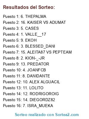 Lista de participantes: 1. VALLE__17, 2. KION-_-JR, 3. BLESSED_DANI, 4. JOANFCB, 5. CASES, 6. THEPALMA, 7. ISRA_MUEKA, 8. DANIDANTE, 9. EKOH, 10. ALEX ALGUACIL, 11. LOLITO, 12. RODRIGOROIG, 13. PREDATOR, 14. DIEGORDZ82, 15. ALEITA87 VS PEPTEAM, 16. KAISER VS ADUMAT.