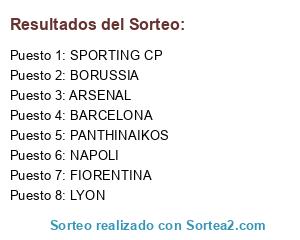 Lista de participantes: ARSENAL, SPORTING CP, FIORENTINA, PANTHINAIKOS, LYON, BORUSSIA, NAPOLI, BARCELONA.