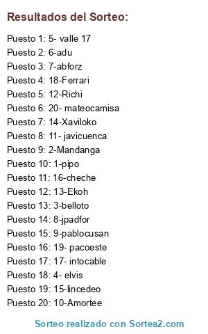 Lista de participantes: 1-pipo, 2-Mandanga, 3-belloto, 4- elvis, 5- valle 17, 6-adu, 7-abforz, 8-jpadfor, 9-pablocusan, 10-Amortee, 11- javicuenca, 12-Richi, 13-Ekoh, 14-Xaviloko, 15-lincedeo, 16-cheche, 17- intocable, 18-Ferrari, 19- pacoeste, 20- mateocamisa.