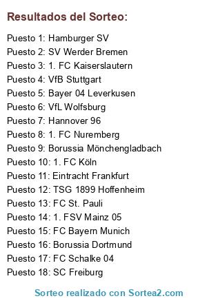 Lista de participantes: 1. FC Kaiserslautern, 1. FC Köln, 1. FC Nuremberg, 1. FSV Mainz 05, Bayer 04 Leverkusen, Borussia Dortmund, Borussia Mönchengladbach, Eintracht Frankfurt, FC Bayern Munich, FC Schalke 04, FC St. Pauli, Hamburger SV, Hannover 96, SC Freiburg, SV Werder Bremen, TSG 1899 Hoffenheim, VfB Stuttgart, VfL Wolfsburg.